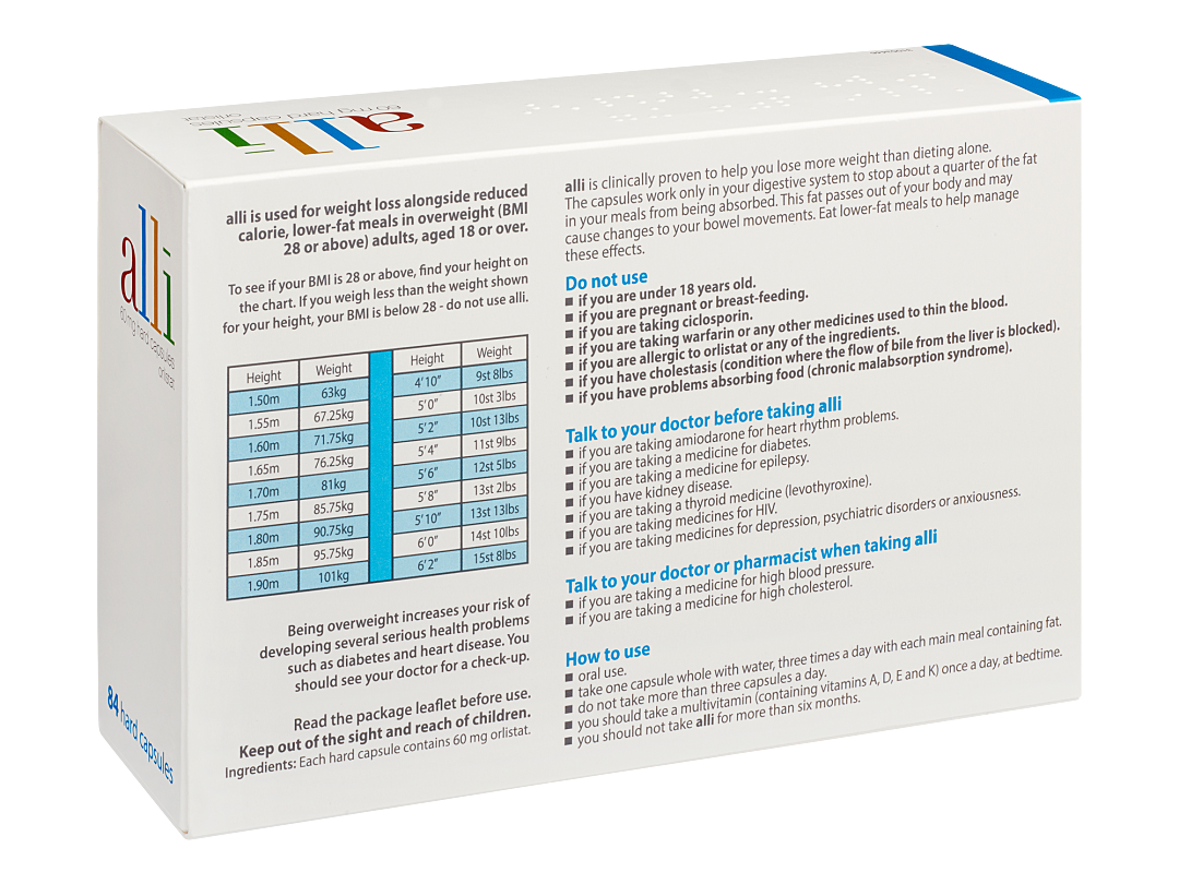 alli is an over-the-counter weight loss tablet that helps you lose weight by reducing how much fat your body absorbs from meals. When taken as prescribed, alli can help you lose an average of 2.5kg more weight than you would by dieting alone.